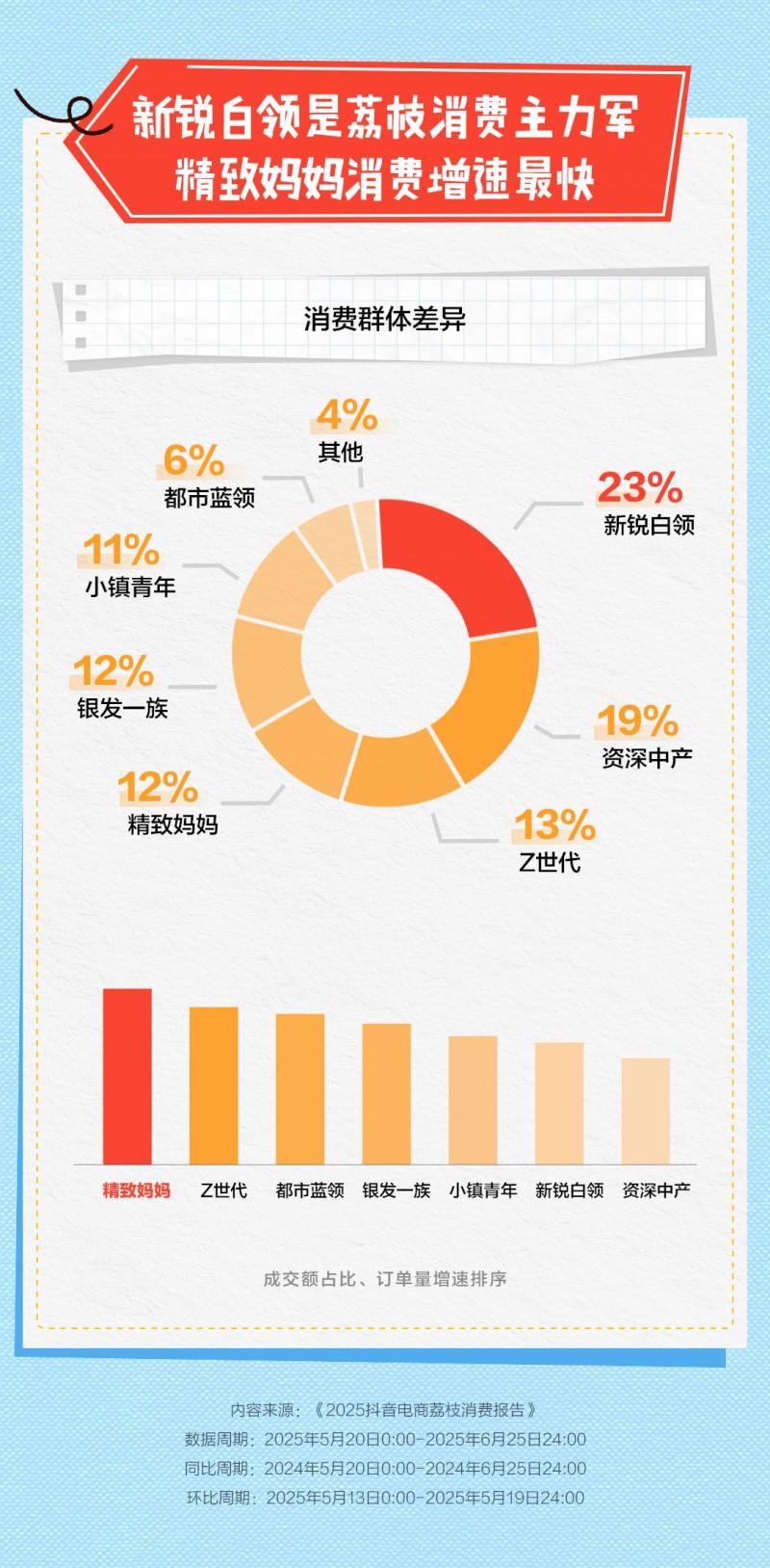 报告显示,在荔枝消费人群中,白领人群是主力军,成交额占比23%,城市中产和Z世代紧随其后。此外,精致妈妈群体荔枝下单量增速最快。