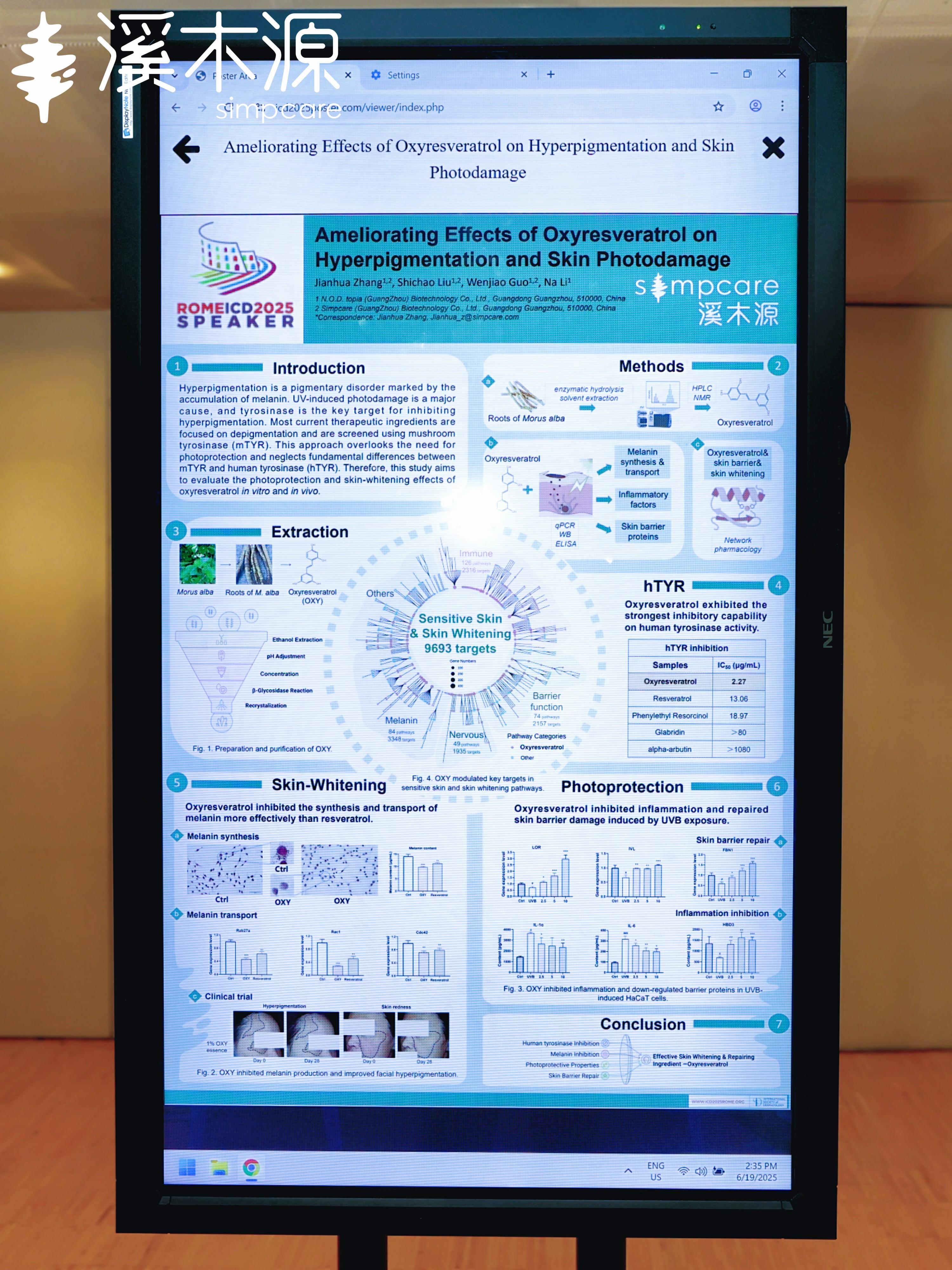 值得一提的是,溪木源关于金山茶花提取物的最新研究成果也同步在2025 ICD大会上以壁报形式展出:该研究证实金山茶花提取物是可用于敏感肌屏障修复与抗衰的天然成分。