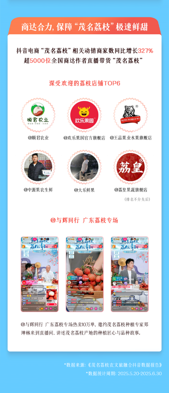 活动期间,抖音电商“茂名荔枝”相关动销商家数同比增长327%,全国超5000位商达作者带货“茂名荔枝”。其中,@与辉同行 广东荔枝专场特邀茂名荔枝种植专家做客直播间讲述产地匠心故事,单场成交破10万单,促成今年荔枝最大场记录。