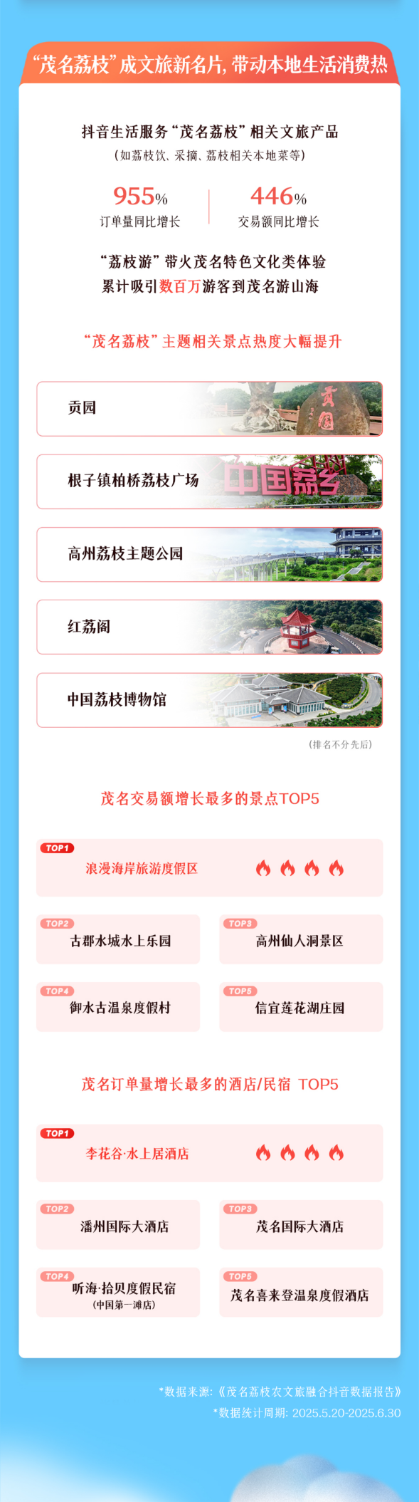 随着“荔枝游”成为热门关键词,数百万游客奔赴茂名,体验更深度的荔枝文化。贡园千年古荔、高州荔枝主题公园、中国荔枝博物馆等荔枝主题景点人气爆棚,成为游客打卡胜地。此外,浪漫海岸旅游度假区、古郡水城水上乐园等景点交易额也实现快速增长,茂名当地酒店/民宿订单量显著提升。“荔枝+文旅”的深度融合,形成了相互促进、共同发展的良好循环,为茂名发展注入了源源不断的新动力。