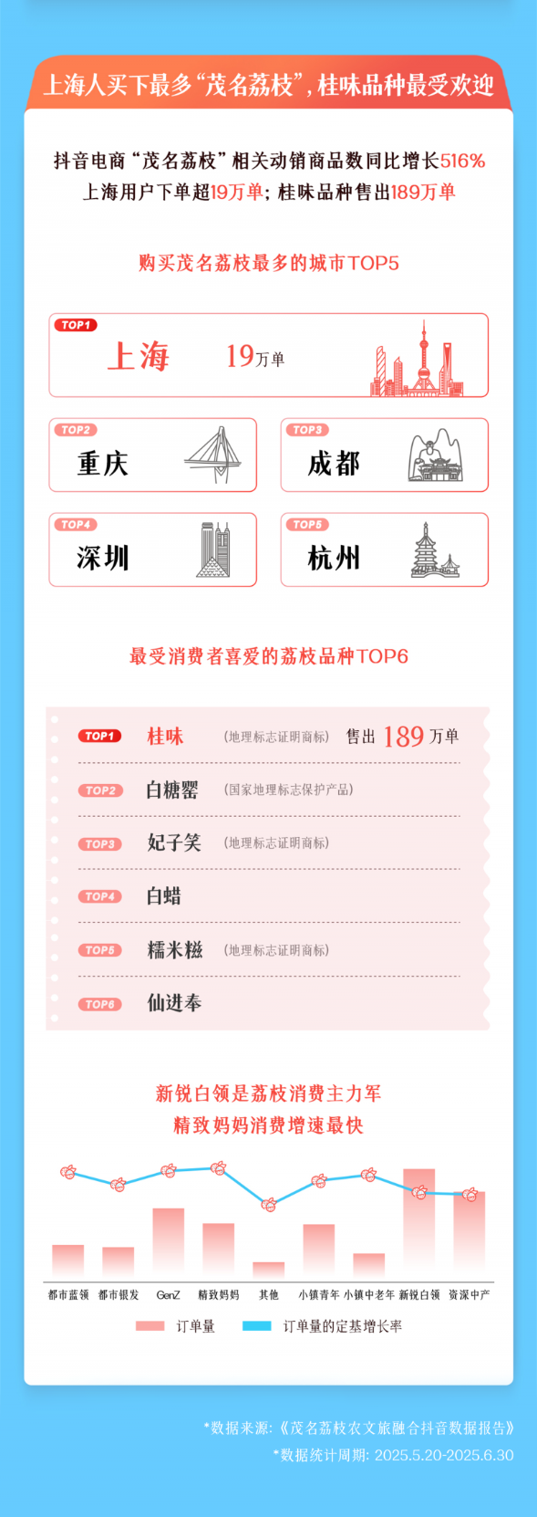 供应链与销售端协同发力,推动茂名荔枝跃升为今夏水果顶流,市场份额迅速攀升至全网第一。从消费数据来看,上海以19万单成为购买最多的城市,桂味以189万单成为最受消费者喜爱的荔枝品种。人群画像中,“新锐白领”是荔枝消费的主力军,“精致妈妈”消费增速最快,展现出茂名荔枝消费的多元潜力。