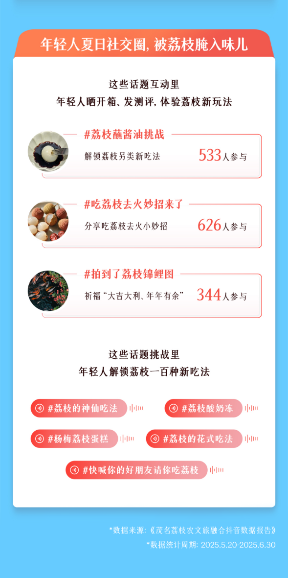 爱吃爱玩的年轻人成为今夏茂名荔枝的传播主力,他们尝试#荔枝蘸酱油挑战,分享#吃荔枝去火妙招,解锁#荔枝酸奶冻 等一百种新吃法,将荔枝从单纯的水果变成了潮流社交货币,迅速融入大众日常生活。