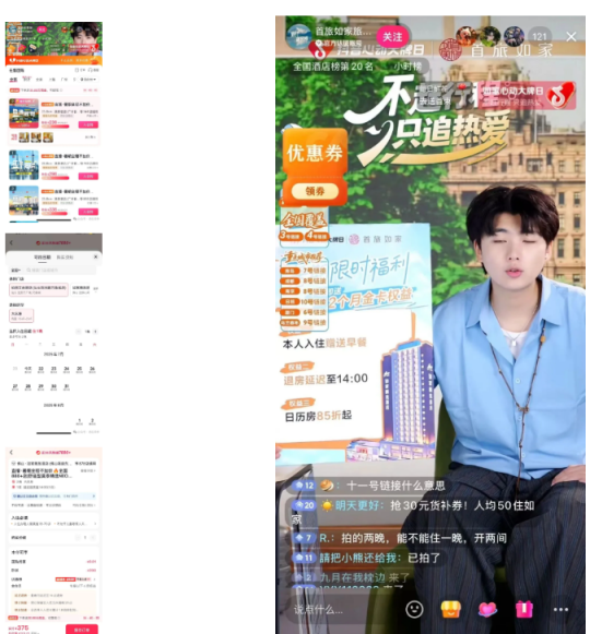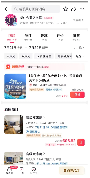 而在直播间的另一端,是华住、如家等头部连锁酒店集团的“全员出动”:品牌账号集中开播、员工上阵介绍房型、推出定制券包、抖音站内交易闭环。这个暑期旺季,酒店集团正集体在内容平台进行一场“线上实验”。