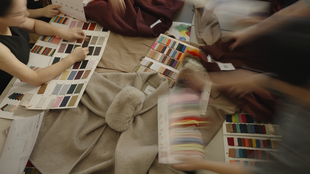 图:广州番禺办公室内,Katch Me员工聚在一起确认色板、面料。