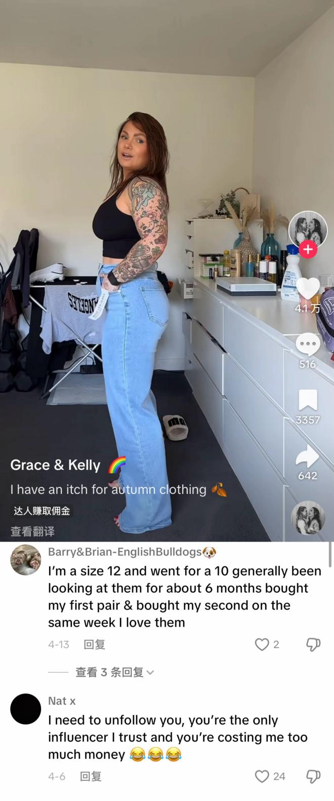 图:TikTok达人Grace发视频夸Katch Me牛仔裤舒服好穿,评论区用户“抱怨”Grace又让自己“剁手”了。