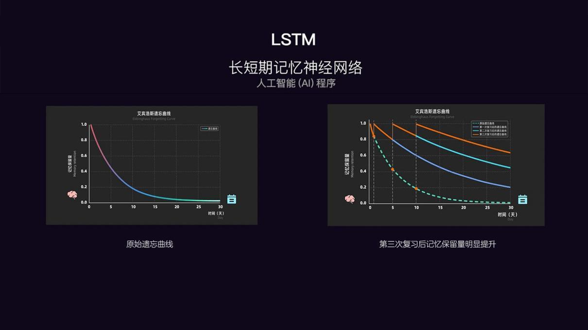 为了真正做到高效背单词,“英语天天练”技术团队自主研发了一个人工智能AI程序——LSTM(长短期记忆神经网络),这个神经网络基于艾宾浩斯遗忘曲线,辅助以16种音形意的专项互动单词题,让每个孩子获得适配自己的记忆方案,按照个性化时间曲线来记忆单词。