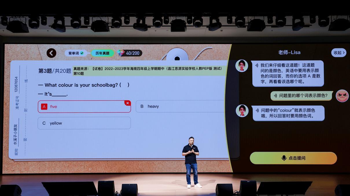 胡博介绍,“英语天天练”引入了专属“AI老师”,并现场演示了AI老师的体验和互动。当孩子出现错误时,AI老师会自动介入,基于孩子的数据和错误进行讲解。根据目前的分析结果,孩子在AI老师介入后,平均12秒就能做对错题,充分展示了AI和大数据在英语学习中的实际效果。