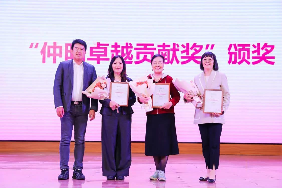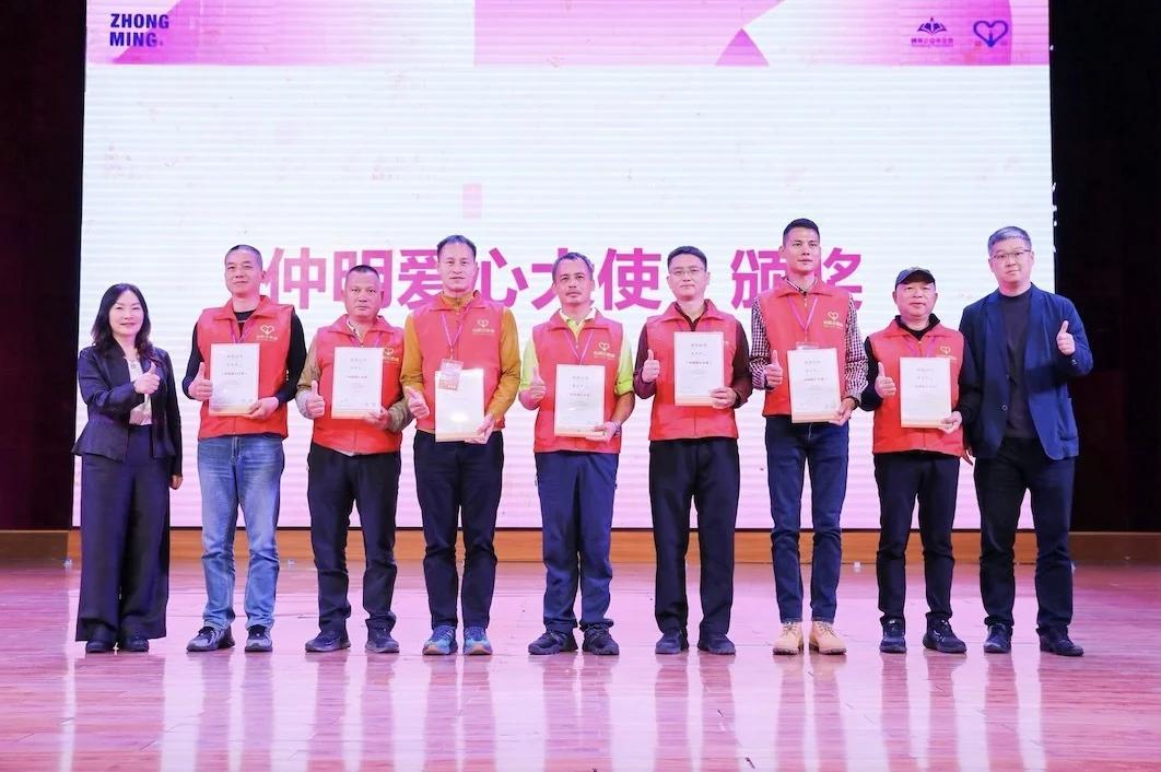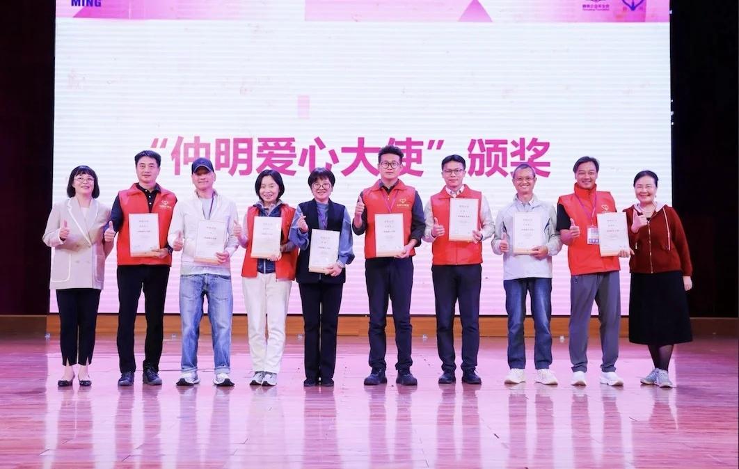 为了感谢陈心宇女士、李萍教授、杨从容女士在其中的贡献,陈翀理事长为他们授予了“仲明卓越贡献奖”。同时,羊城晚报党委委员、副社长、副总编辑胡泉,陈心宇女士,李萍教授,杨从容女士一起为15名“仲明爱心公益大使”颁奖。