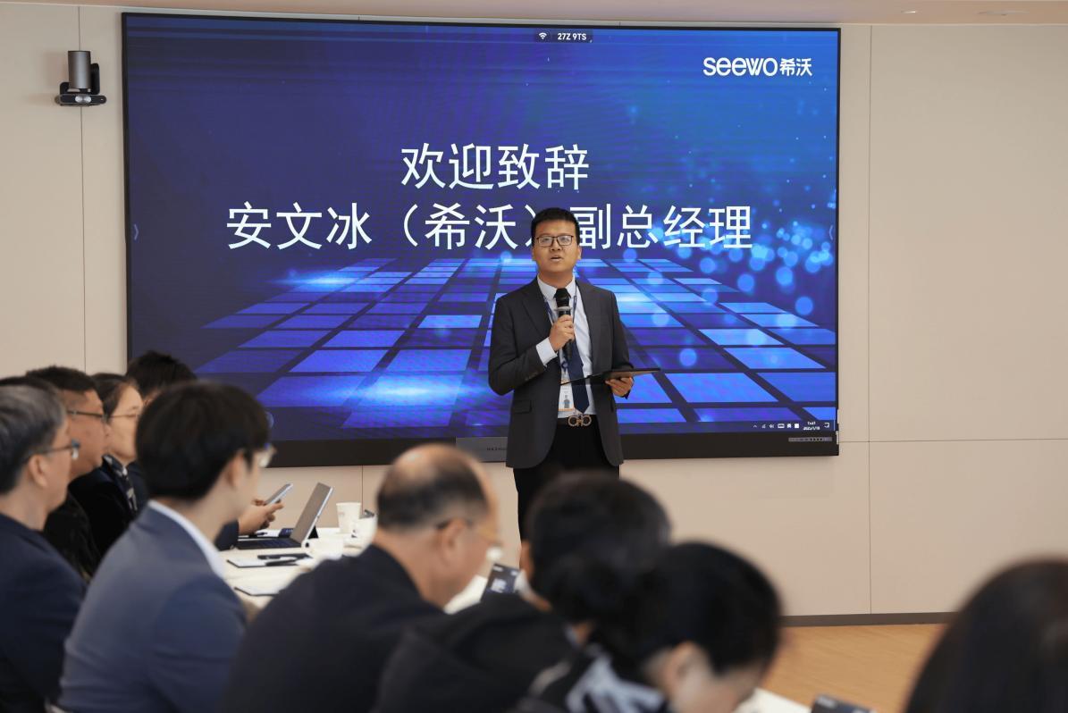 在开场致辞中,希沃副总经理安文冰对一直以来支持和关怀希沃的各位来宾报以诚挚欢迎,他从多个维度介绍了希沃多年来不断创新、科技引领的发展历程和品牌实力,并邀请众多高校领导、专家一起,探索更多合作方向。