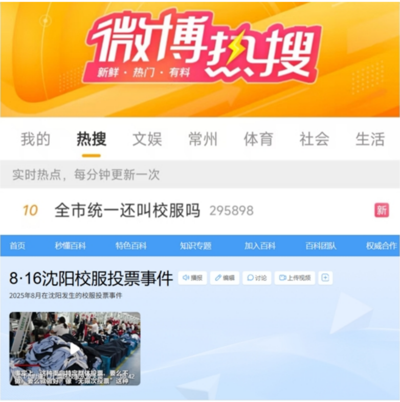 今年以来,江西南昌、赣州及辽宁沈阳等地试行“全市统一校服”政策,均暴露出诸多问题。沈阳的校服公众网络投票引发轩然大波,部分款式一小时涨票数万张,虚假投票嫌疑浓厚,“全市统一还叫校服吗”话题冲上微博热搜,阅读量超2000万,“沈阳全民票选校服背后有哪些隐忧”“中小学校服投票数异常被质疑刷票”“官方回应中小学校服投票数异常”等关联话题多次登上热搜榜,相关争议至今未平息。而江西两地的问题则集中在质量与监管层面:赣州的校服销售渠道极为混乱,校门口的文具店、便利店、烟酒店甚至路边地摊都在售卖,部分商家悬挂“中国校服十大品牌”的虚假宣传标语;这些校服普遍存在做工粗糙、气味刺鼻等问题,不同批次产品在面料、色差上差异显著,负面影响日益凸显。