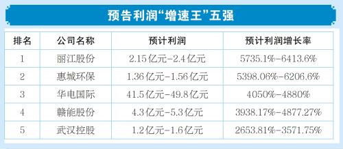 本次预告披露中电力、有色、文旅等行业表现最为突出。业绩增长率前五名为丽江股份、惠城环保、华电国际、赣能股份、武汉控股。