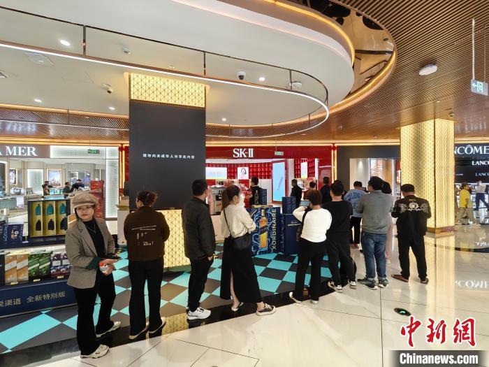 记者近日在海口市区多家免税店看到,各种“中国红”和“龙年元素”点缀其中,香化、珠宝、进口酒等品类专区均有折扣价,不时出现消费者排队购物的景象。