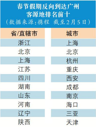 另据“去哪儿”大数据显示,从机票预订情况看,春节期间,广州客源地TOP10为上海、成都、北京、重庆、西安、杭州、海口、昆明、南京和长春。