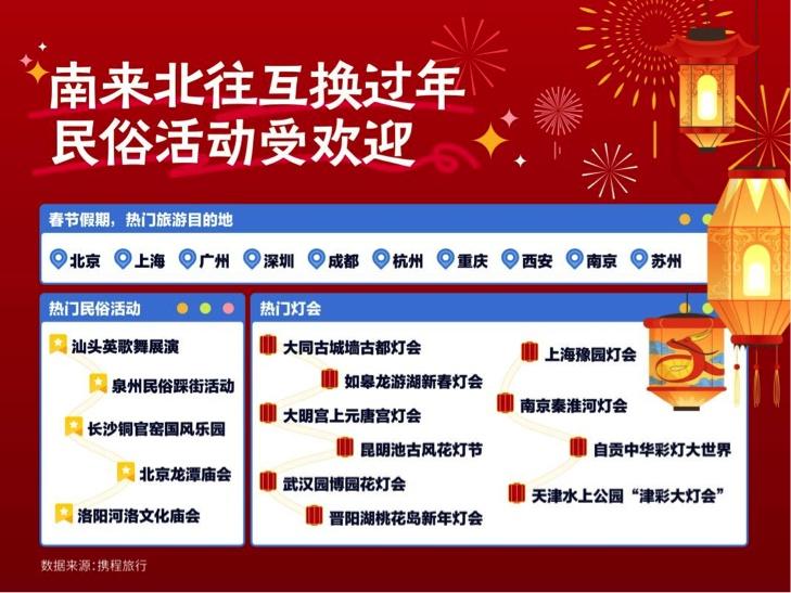 不论南北,年味是共同主题。新春灯会、舞龙表演、庙会市集、非遗秀场等活动成为游客新春出游的热选。在携程平台,龙年春节灯会搜索量同比翻倍,热度较高的新春灯会有:武汉园博园花灯会、天津水上公园“津彩大灯会”、南京秦淮河灯会、自贡中华彩灯大世界、大明宫上元唐宫灯会、上海豫园灯会、如皋龙游湖新春灯会、大同古城墙古都灯会、晋阳湖桃花岛新年灯会、昆明池古风花灯节等。热门民俗活动有:汕头英歌舞展演、洛阳河洛文化庙会、北京龙潭庙会、长沙铜官窑国风乐园、泉州民俗踩街活动等。