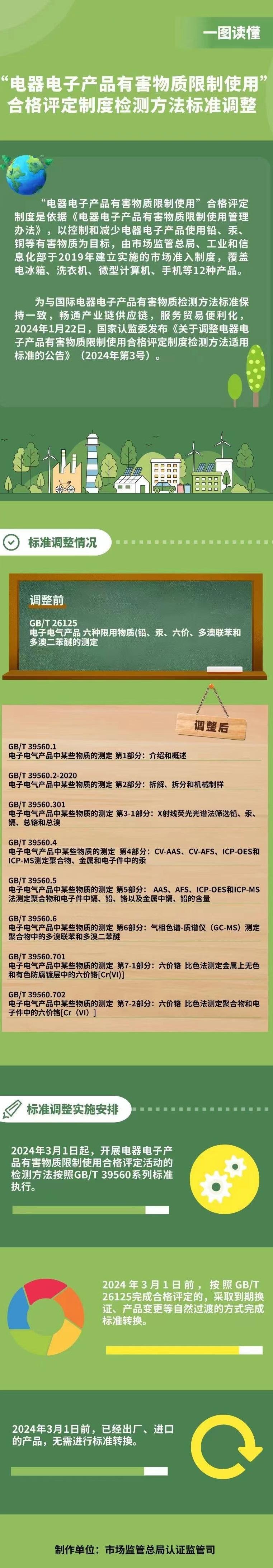 为与国际电器电子产品有害物质检测方法标准保持一致,畅通产业链供应链,服务贸易便利化,国家认监委近日发布《关于调整电器电子产品有害物质限制使用合格评定制度检测方法适用标准的公告》。 2024年3月1日起,开展电器电子产品有害物质限制使用合格评定活动的检测方法按照GB/T 39560系列标准执行。