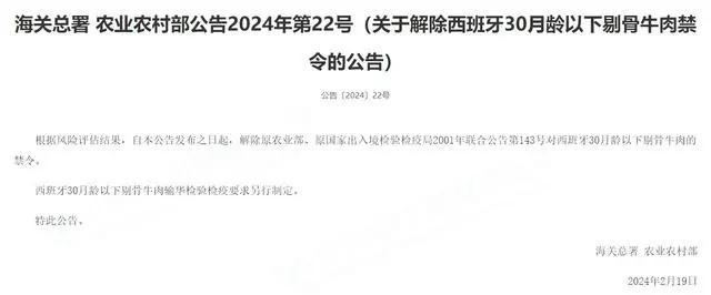 海关总署 农业农村部公告2024年第22号(关于解除西班牙30月龄以下剔骨牛肉禁令的公告)