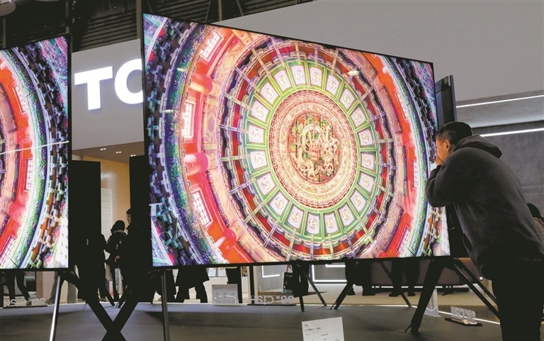 一名参观者在展台上近距离观察一款电视展品的屏幕。图/新华社发