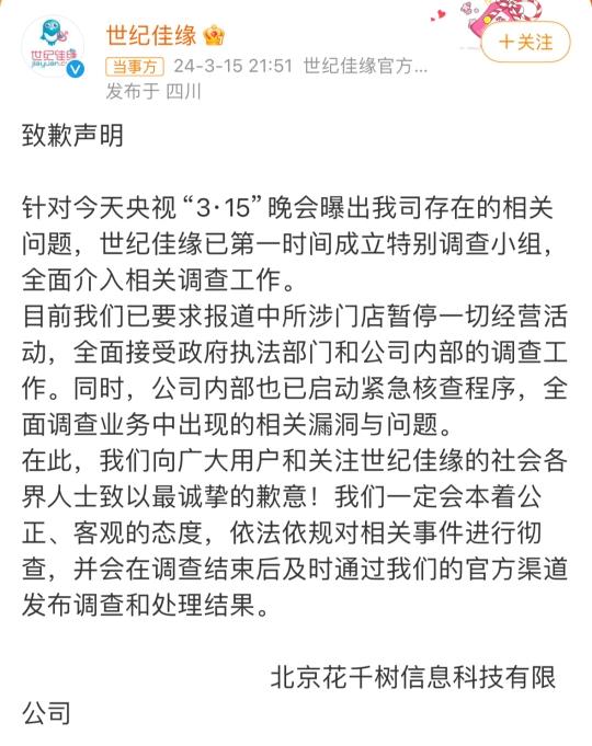3月15日晚间,世纪佳缘官方微博发布“致歉声明”。声明称,“针对今天央视‘3·15’晚会曝出我司存在的相关问题,世纪佳缘已第一时间成立特别调查小组,全面介入相关调查工作。”