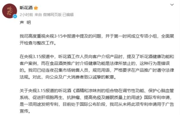 在央视3.15报道中,听花酒工作人员向客户介绍产品时,提及了听花酒健康功能和客户案例,而在食品酒类推广时介绍健康功能是法律所禁止的,这种行为是错误的。我司已经连夜召集市场销售人员,规范用语,严格要求在产品推广时遵守法律法规。对此,向公众及广大消费者致以诚挚的歉意。