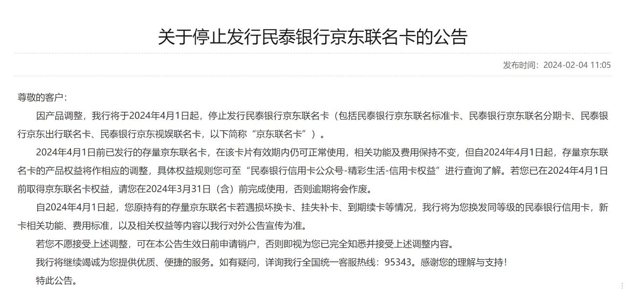 根据浙江民泰银行发布的公告,该行将于2024年4月1日起,停止发行民泰银行京东联名卡(包括民泰银行京东联名标准卡、民泰银行京东联名分期卡、民泰银行京东出行联名卡、民泰银行京东视娱联名卡)。