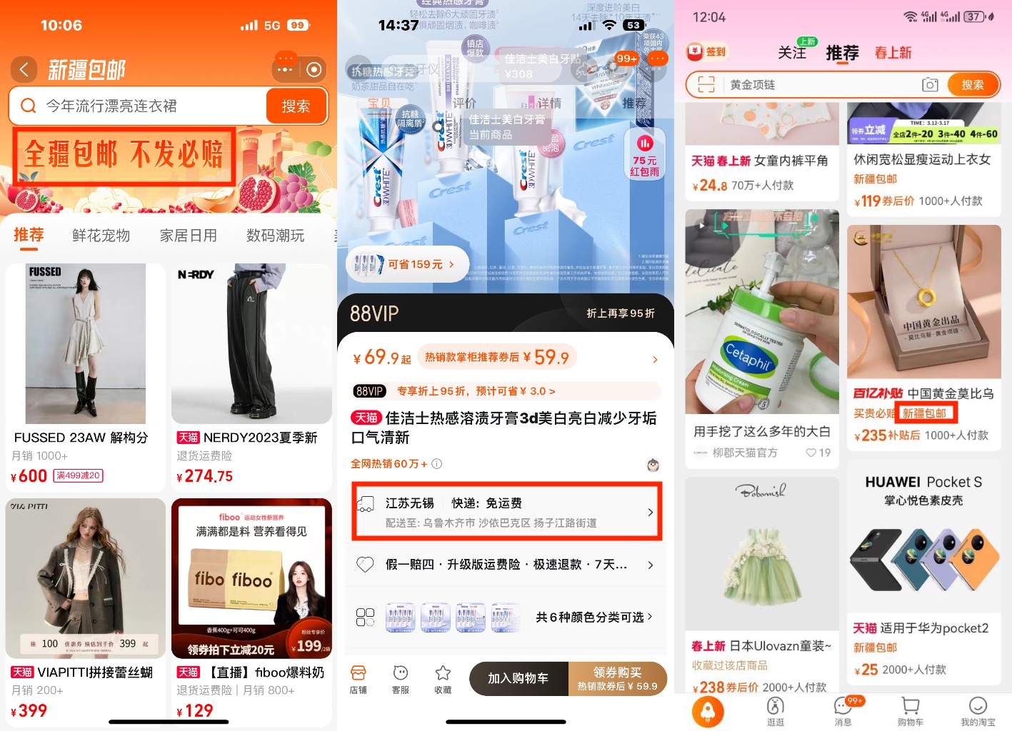 淘宝方面表示,“新疆包邮”频道将长期运营,提供给新疆消费者最方便、优质的购物体验。目前,频道内商品涵盖服饰、快消、食品、家清百货等各个类目,无论是几块钱的零食还是上千元的首饰,全部支持包邮发往新疆。此外,在淘宝搜索及商品详情页面,也都能看到“新疆包邮”的专属标签,方便新疆用户筛选购买。