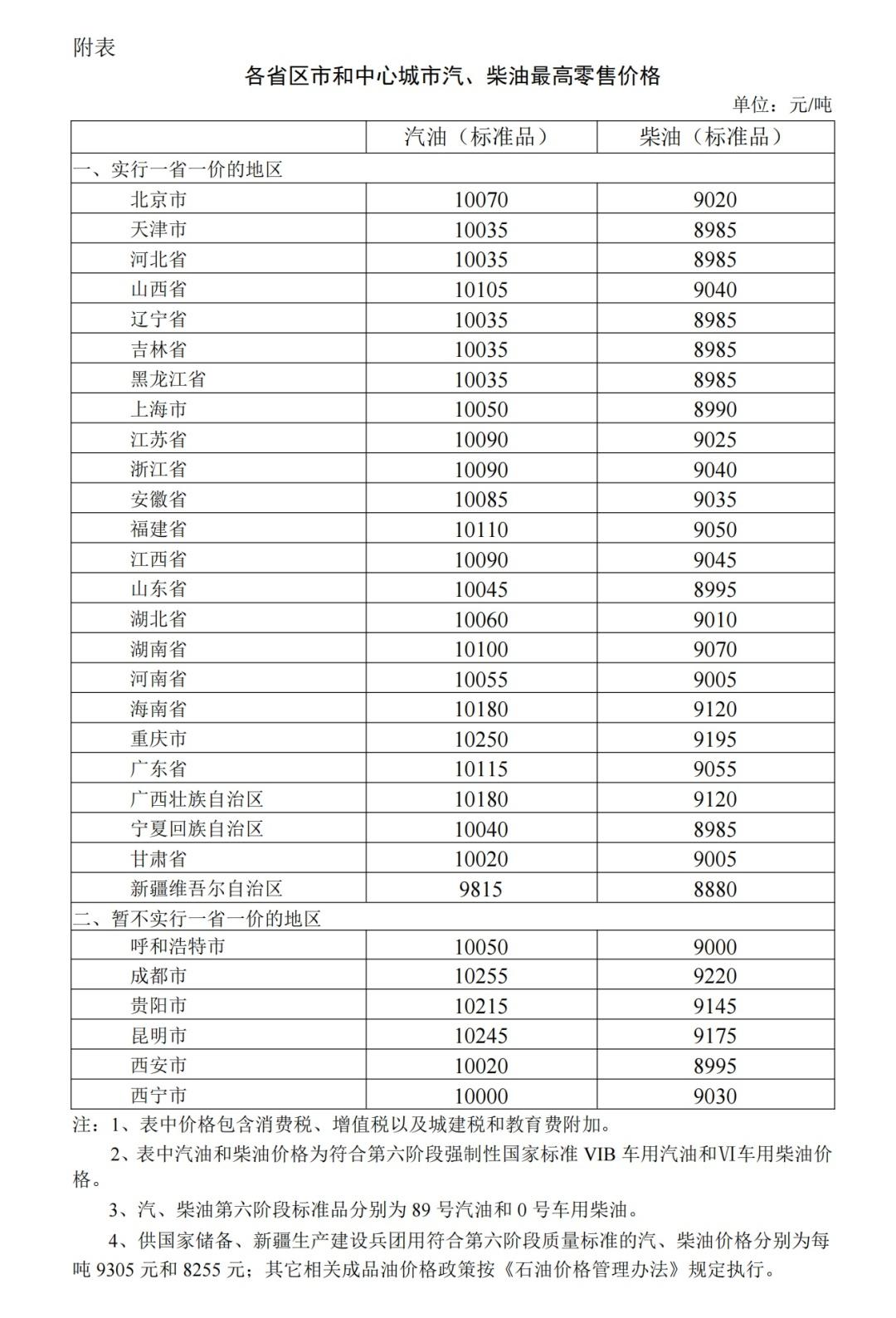 根据近期国际市场油价变化情况,按照现行成品油价格形成机制,自2024年4月1日24时起,国内汽、柴油价格(标准品,下同)每吨分别提高200元、190元。调整后,各省(区、市)和中心城市汽、柴油最高零售价格见附表。