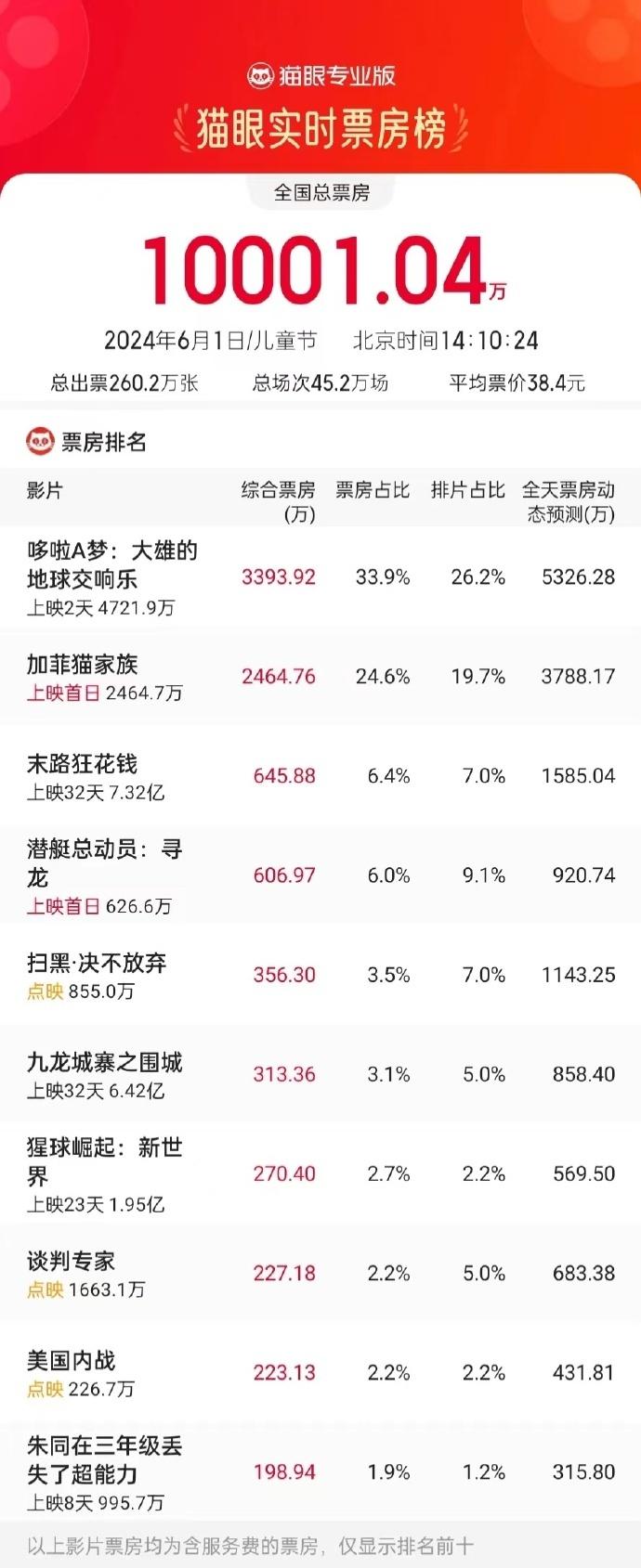 据猫眼专业版数据,6月1日14时10分,2024六一儿童节单日票房破1亿元,《哆啦A梦:大雄的地球交响乐》《加菲猫家族》《末路狂花钱》分列票房榜前三位。