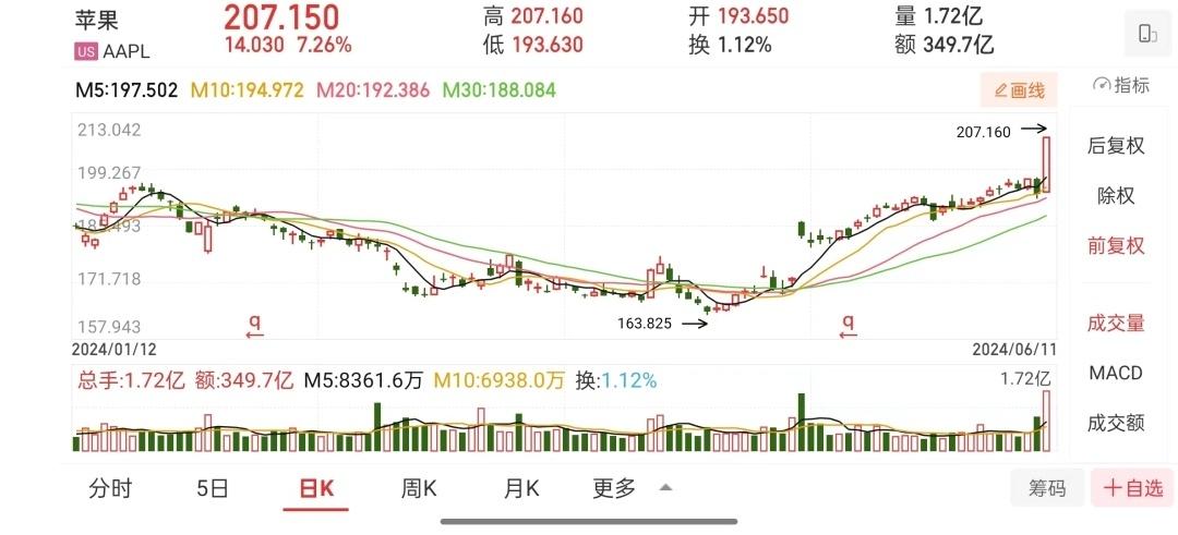 截至周二收盘,苹果股价达 207.15 美元,涨 7.26%,股价创历史新高,总市值达 3.2万亿美元。而前一日即 WWDC (苹果全球开发者大会,“Worldwide Developers Conference”)当日,苹果股价出现了下跌。