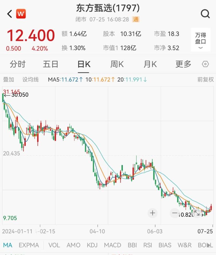 今年以来,不仅是董宇辉,多位东方甄选旗下的主播都陷入了不同的舆论风波。俞敏洪关于东方甄选、对主播们的言论更是多番冲上社交平台热搜。Wind显示,今年年初以来,东方甄选的股价跌幅超过55%。截至7月25日港股收盘,东方甄选股价报12.40港元/股,市值128亿港元。
