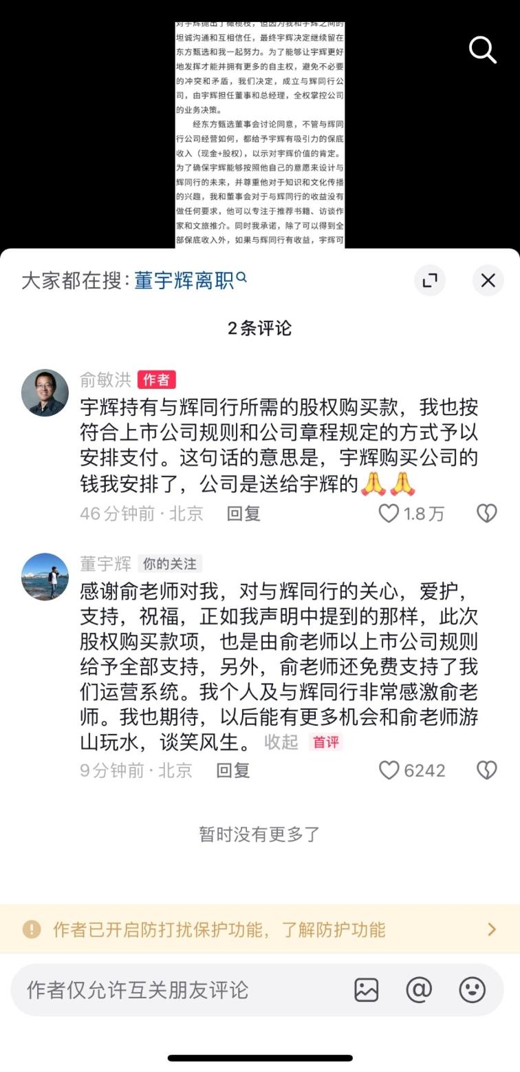 董宇辉亦在该回应中跟帖称,“感谢俞老师对我,对与辉同行的关心,爱护,支持,祝福,正如我声明中提到的那样,此次股权购买款项,也是由俞老师以上市公司规则给予全部支持,另外,俞老师还免费支持了我们运营系统。我个人及与辉同行非常感激俞老师。”