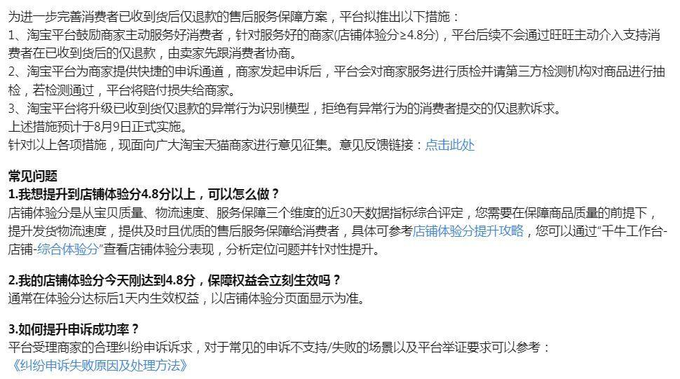 给予商家更多自主处置权的同时,淘宝还将提供多份售后服务方案供商家选择,引导商家持续优化售后服务,减少“仅退款”带来的纠纷及资损。同时,淘宝还优化了仅退款申诉环节。商家发起申诉后,平台会请第三方检测机构对商品进行抽检,若检测通过,平台将赔付损失给商家。