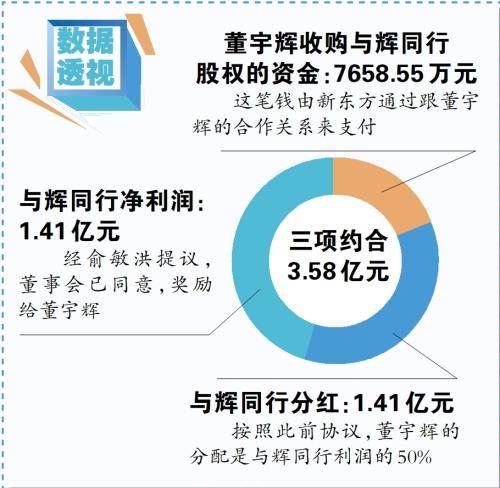 董宇辉在这次离职时,俞敏洪到底分给了他多少钱?公告里面没有具体说明。不过,俞敏洪在26日的股东电话会上披露的情况能大致知晓。目前外界较为认可的统计方式是,董宇辉已拿到了此前约定的50%,即1.4亿元净利润分成,加上董事会同意留在与辉同行的1.4亿元净利润,以及俞敏洪安排给其收购与辉同行股权的7658.55万元,合计约3.58亿元,还不包括其个人在东方甄选的薪酬等。