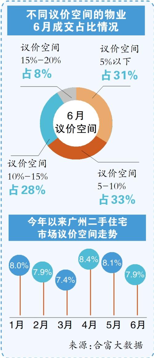从业主的议价指数来看,在政策的托底效应之下呈现出一定的积极转变。合富大数据显示,自今年4月份议价空间达到8.4%的高位以来,该数据已经连续下降两个月到达7.9%。与此同时,从细分数据来看大幅降价的成交比例明显下降。而根据该机构对不同降幅的降价盘成交的分析,议价空间15%~20%的大幅降价成交个案占比,从5月的15%降至6月的8%。