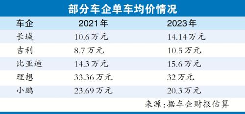 乘联会数据显示,近年的车市单车价格呈现持续上升的态势,2019年是14.2万元,2020年是15.3万元,今年累计平均是17.9万元,6月更是达到了18.6万元。从多家车企的财报中可以留意到,中国品牌的单车成交均价都在上升,如从2021年到2023年间,长城汽车单车均价涨了1.5万元左右,两年间单车均价突破10万元到14.14万元,比亚迪也在两年间涨了1.3万元,至15.6万元。