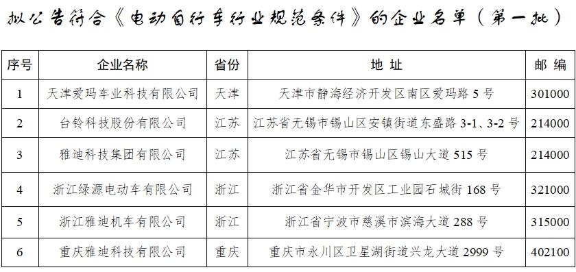 为加强电动自行车行业管理,推动我国电动自行车行业健康可持续发展,依据《电动自行车行业规范条件》及《电动自行车行业规范公告管理办法》,工业和信息化部开展电动自行车行业规范管理工作。经企业申请、省级工业和信息化主管部门初审、文件资料审查、现场查验等程序,初步确定6家企业列入符合《电动自行车行业规范条件》企业名单(第一批)。现予以公示,如有异议,请于公示之日起10个工作日内以书面或传真形式反馈。