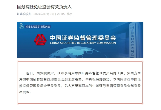 证监会7月30日晚间发布消息,近日,国务院决定,任命李明为中国证券监督管理委员会副主席,免去方星海的中国证券监督管理委员会副主席职务。中央组织部通知,李明同志任中国证券监督管理委员会党委委员,免去方星海同志的中国证券监督管理委员会党委委员职务。