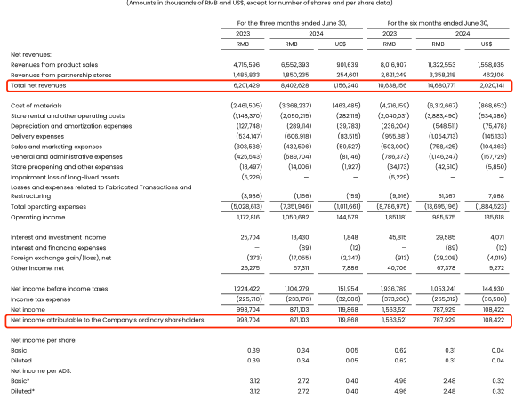 瑞幸咖啡2024年二季度及上半年业绩,来源于财报