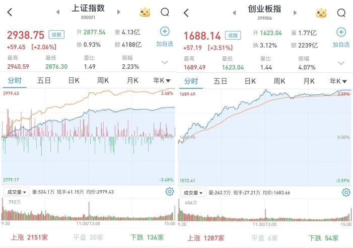 至收盘,上证综指涨2.06%,报2938.75点;科创50指数涨4.7%,报743.37点;深证成指涨3.37%,报8754.09点;创业板指涨3.51%,报1688.14点。