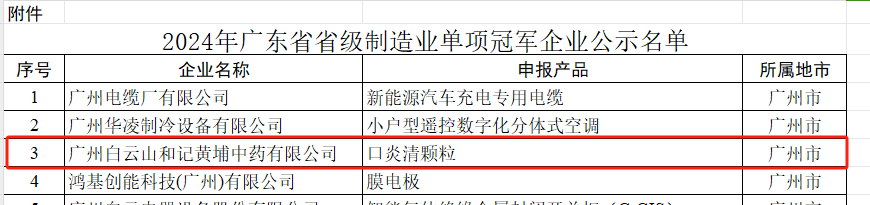 近日,广东省工业和信息化厅揭晓2024年广东省省级制造业单项冠军企业名单,白云山和黄中药生产的白云山口炎清颗粒入选为广东省制造业单项冠军,成为继白云山板蓝根颗粒后又一入选的中药大品种。