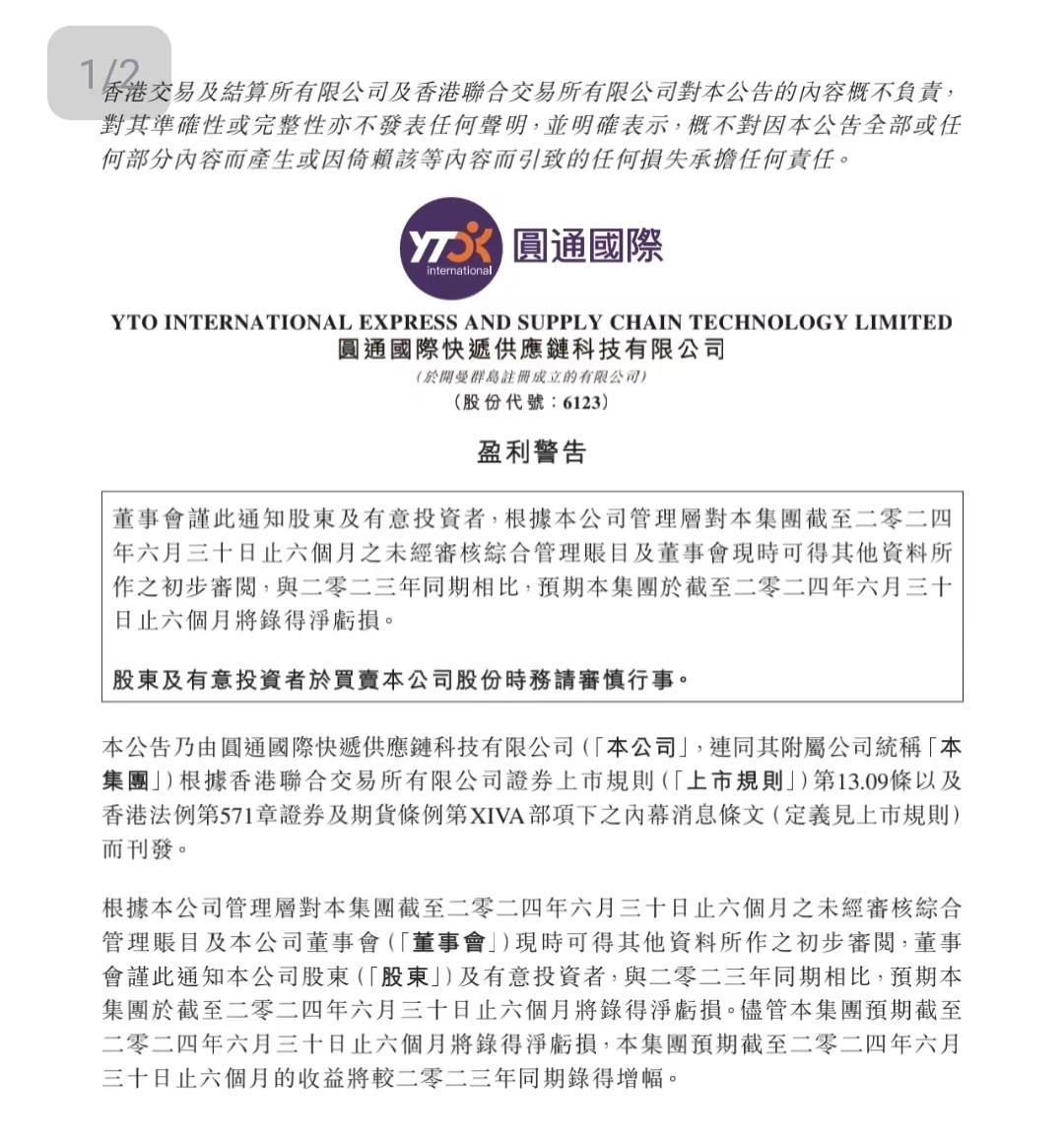 7月31日,圆通国际快递公布公告称,与2023年同期相比,预期集团于截至2024年6月30日止六个月将录得净亏损。尽管集团预期截至2024年6月30日止六个月将录得净亏损,集团预期截至2024年6月30日止六个月的收益将较2023年同期录得增幅。集团预期截至2024年6月30日止的六个月将录得净亏损介乎约3800万港元至4700万港元,而于2023年同期录得纯利约1.084亿港元。