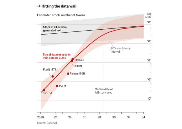 研究公司Epoch AI预测,到2028年互联网上所有高质量的文本数据都将被使用完毕,机器学习数据集可能会在2026年前耗尽所有“高质量语言数据”。