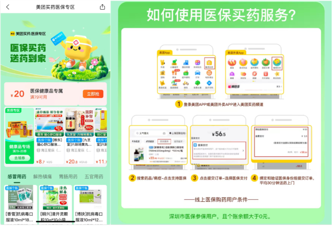 美团买药方面表示,作为首批获准开通线上医保买药服务的平台,美团买药联合海王星辰、叮当快药等连锁品牌,快速拓展服务规模,已实现深圳全城覆盖。深圳市参保人员在美团买药选购药品时,认准带有蓝色“医保个账”标签的药品,提交订单后选择“医保支付”,就可以轻松实现医保买药。