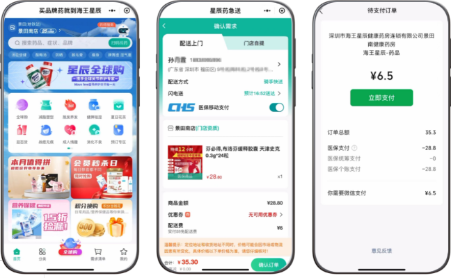 首批上线的药房覆盖海王星辰、叮当快药、深圳国大、圆心友和等连锁药房的400余家门店,微信医保个账支付为深圳参保人提供了简单易操作的人性化购药支付体验。以国内头部连锁药房海王星辰为例,参保用户进入“星辰药急送”小程序后,搜索附近的医保定点零售药店,在进店后要注意选购标有“医保标识”的药品,否则所选药品将不能通过医保进行报销。
