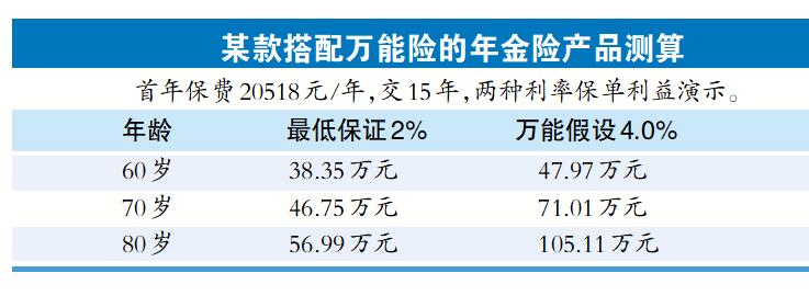 万能险作为市面上较受欢迎的储蓄险产品之一,多数以年金+万能险、增额寿险+万能险的形式进行销售。“万能险有保证收益,然后还有一定的浮动收益,对于稳健型的投资者来说是不错的选择。”一位保险代理人告诉记者,目前市面上常见万能险的保证收益为2%,低的也有1.5%。保证收益写入合同,是不会随着利率下降而改变的。“如果消费者选择了保证利率2%的万能险,那么以后哪怕是监管指导下调预定利率,已购保单的保证利率仍然可以按照2%享受复利,等于提前锁定了这部分利率。”
