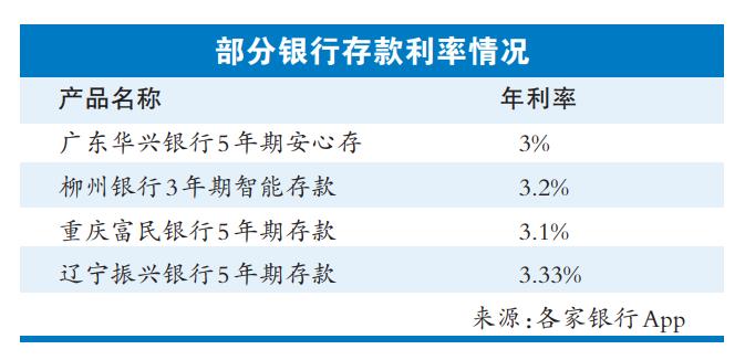 此外,目前部分中小银行仍有年利率3%以上存款产品。如广东华兴银行的5年期安心存(1000元起存)年利率3%;柳州银行的智能存款产品中,三年期年利率为3.2%;重庆富民银行存款(整存整取)产品中,3年期年利率3%,5年期年利率3.1%;辽宁振兴银行整存整取存款产品中,3年期和5年期产品年利率分别达3.15%和3.33%。