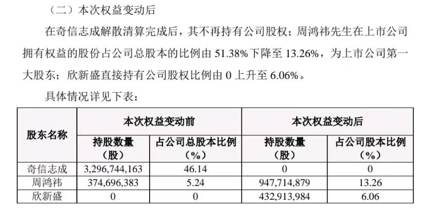 奇信志成完成股份分配后,其各股东由通过奇信志成间接持有三六零股份变更为直接持股。奇信志成持有三六零股权比例由46.14%下降至0,其上层股东天津欣新盛股权投资合伙企业(有限合伙)(以下简称“欣新盛”)直接持有三六零股权比例由 0上升至 6.06%。周鸿祎先生由直接持有三六零5.24%股权和通过奇信志成间接持有三六零8.02%股权,变更为直接持有三六零13.26%股权,为上市公司第一大股东。
