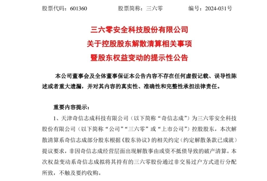8月2日晚,三六零安全科技股份有限公司发布了关于控股股东解散清算相关事项暨股东权益变动的提示性公告。