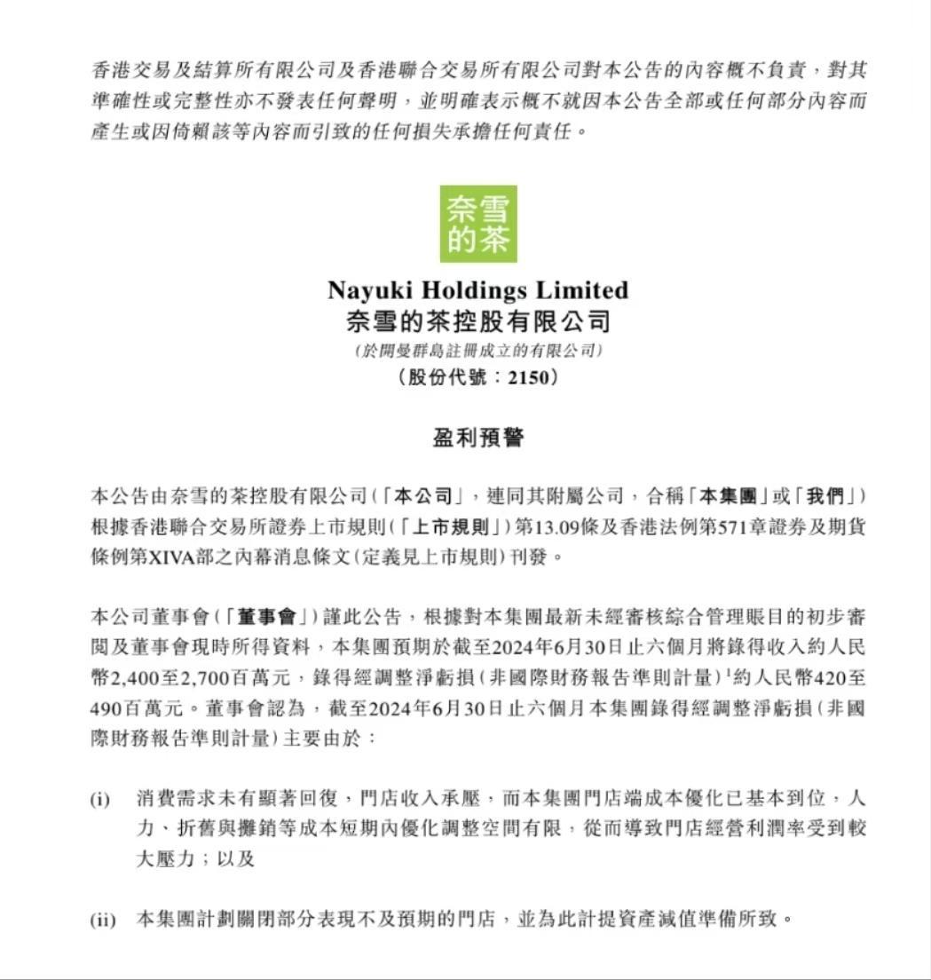 近日,奈雪的茶发布最新《盈利预警》,称截至2024年6月30日,其预计收入约为24.00亿-27.00亿元。在非国际财务报告准则计量下,经调整净亏损为4.20亿元-4.90亿元。2023年同期,奈雪的茶收入为25.94亿元,净利润为6609.8万元,经调整净利润为7020万元。