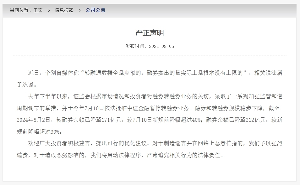 8月5日,中国证券金融股份有限公司(简称“中证金融”)官网午间发布声明称,近日,个别自媒体称“转融通数据全是虚拟的,融券卖出的量实际上是根本没有上限的”,相关说法属于造谣。