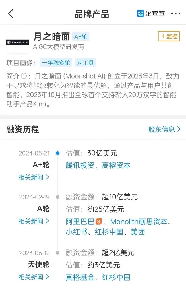 企查查显示,月之暗面已完成三笔融资,获红杉中国、真格基金等机构投资。
